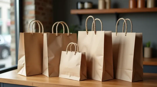 Le papier kraft séduit par son image écologique et sa résistance. Le kraft brun non blanchi communique une image naturelle et authentique, tandis que le kraft blanc offre un rendu d’impression supérieur pour des designs colorés et complexes. Le type de poignée influence directement la capacité de charge : les poignées plates collées conviennent aux charges légères (vêtements, papeterie), tandis que les poignées torsadées en papier supportent des poids plus importants (jusqu’à 5-7 kg pour un sac bien conçu).