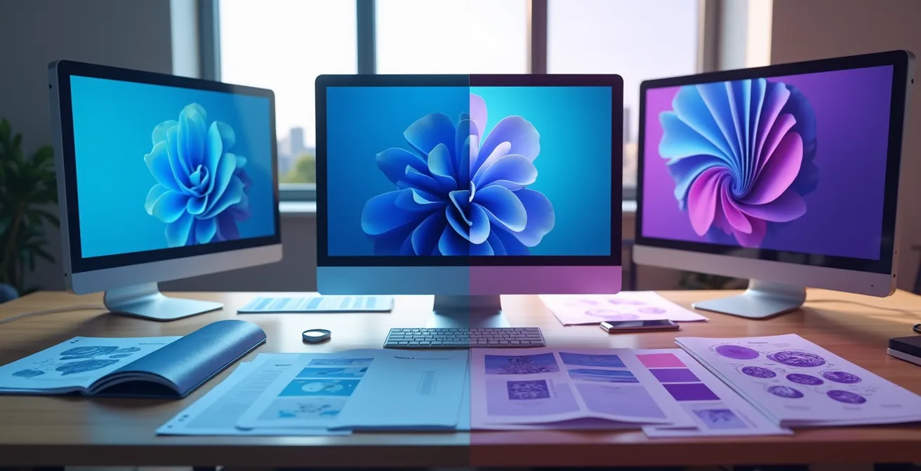 Faire confiance à son écran pour juger une couleur destinée à l’impression est la deuxième erreur la plus courante. Même si votre fichier est parfaitement configuré en CMJN, votre écran, lui, continue de l’afficher en RVB. Il simule le rendu CMJN. Cette simulation est influencée par des dizaines de variables : le modèle de votre moniteur, son âge, la luminosité de votre pièce, la carte graphique de votre ordinateur et, surtout, son absence de calibration professionnelle. Votre perception est donc faussée par défaut.