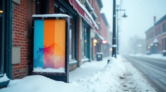 Les cycles de gel et dégel représentent le principal ennemi de la signalétique adhésive au Québec. L’eau qui s’infiltre sous le vinyle gèle, se dilate et crée des bulles ou des décollements. Pour minimiser ce risque, privilégiez les vinyles à adhésif permanent, assurez-vous que la surface d’application est parfaitement propre et sèche, et appliquez une pression uniforme avec un racloir professionnel. L’utilisation d’œillets renforcés sur les bannières permet également de répartir la tension et d’éviter les déchirures lors des vents hivernaux.